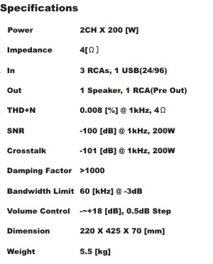 Power		2CH X 200 [W] 0.2 [%] @ 10Hz-20Khz, 4Ω